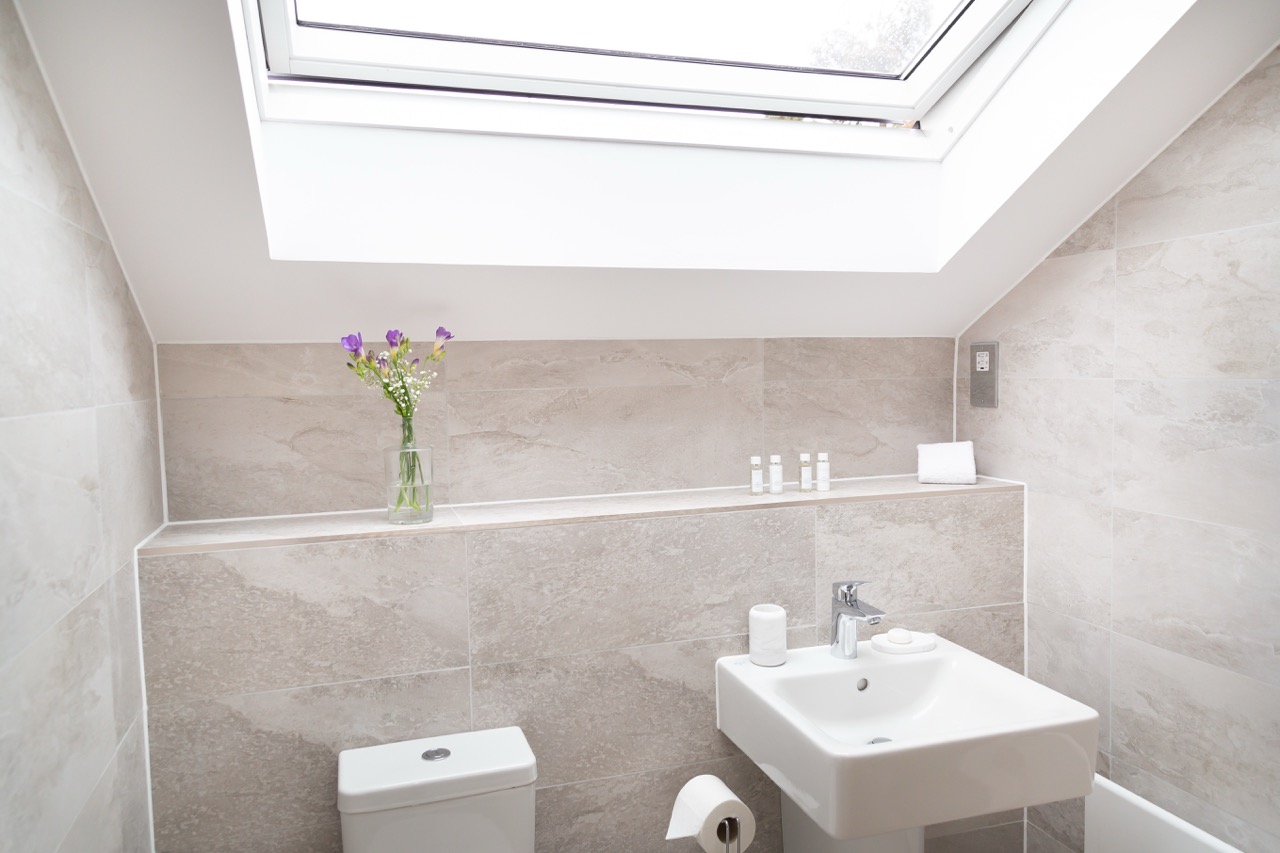 Upstairs, the bedroom is a calm and inviting retreat, complete with luxury towels and Egyptian cotton linen for a restful night’s sleep. The bathroom is sleek and contemporary, offering a shower over bath, heated towel rail and premium finishes. Practical touches such as a hair dryer, iron and ironing board make your stay effortless, while a private terrace provides the perfect spot for morning coffee or evening drinks.